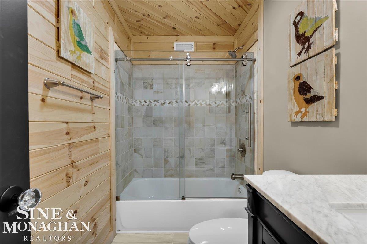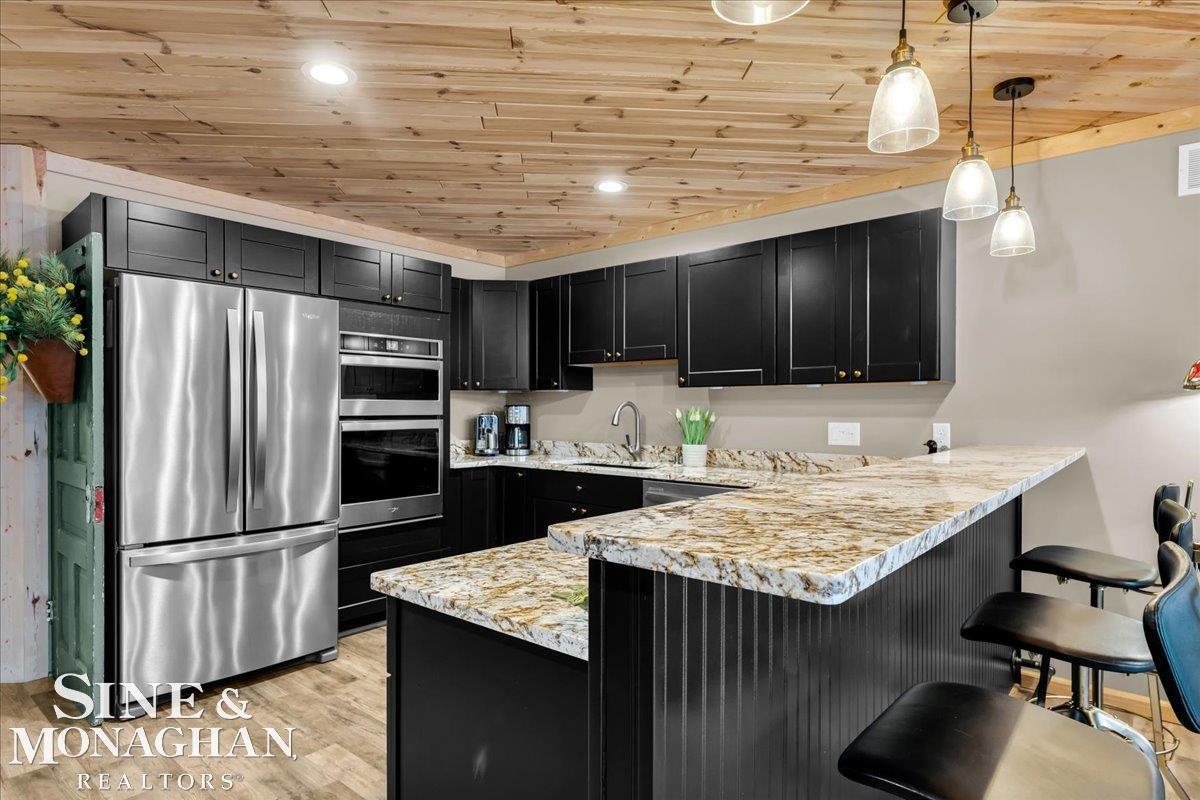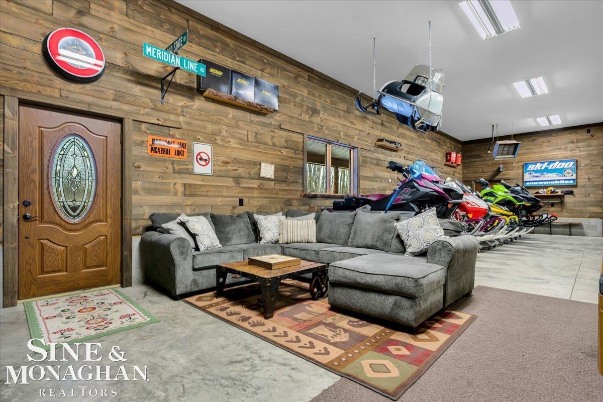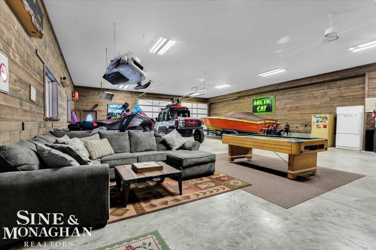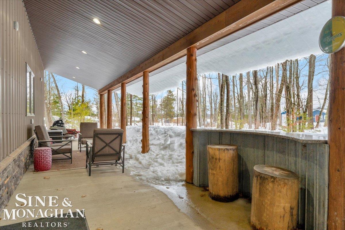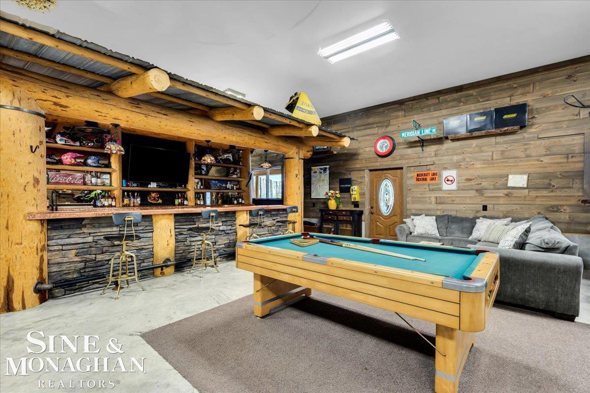 This extraordinary, one-of-a-kind barndominium is everything you imagine when you dream of the perfect up-north escape—crafted with intention, designed with character, and finished with no detail overlooked. More than just another Northern Michigan property- this is a lifestyle. Every inch of this home has been thoughtfully curated. From locally sourced timbers that frame the stunning custom full bar to the hammered copper countertops and carefully selected reclaimed and vintage elements throughout—this property blends rustic charm with refined, modern comfort in a way that is truly unmatched. The recently completed upper-level living space offers a warm and inviting retreat, featuring a spacious primary suite with a cozy sitting area and a spa-like bath complete with heated floors, a walk-in stone shower, dual marble vanities, a linen closet, and generous his-and-hers closets. Designed for gathering, the open-concept kitchen, dining, and living area is perfect for entertaining. Enjoy a large eat-in nook, stainless steel appliances, granite countertops, and access to a private balcony overlooking serene lake views. Two additional sleeping areas and a full bath—also featuring heated flooring—provide ample space to host family and guests with ease. Set on 10 beautiful acres directly across from Big Bear Lake, this property is an outdoor enthusiast’s dream. The expansive barn is built to impress, offering heated floors throughout, making it ideal for year-round use, storage, or housing all of your recreational toys. With immediate access to trails and endless room to roam, adventure is right outside your door. Ideally located just minutes from Lewiston, approximately 30 minutes to Gaylord, and under an hour to Boyne Mountain. Additional features include a striking live-edge custom staircase with ambient lighting and a comprehensive audio and video surveillance system throughout the interior and exterior of the property. An amazing opportunity to own a truly u